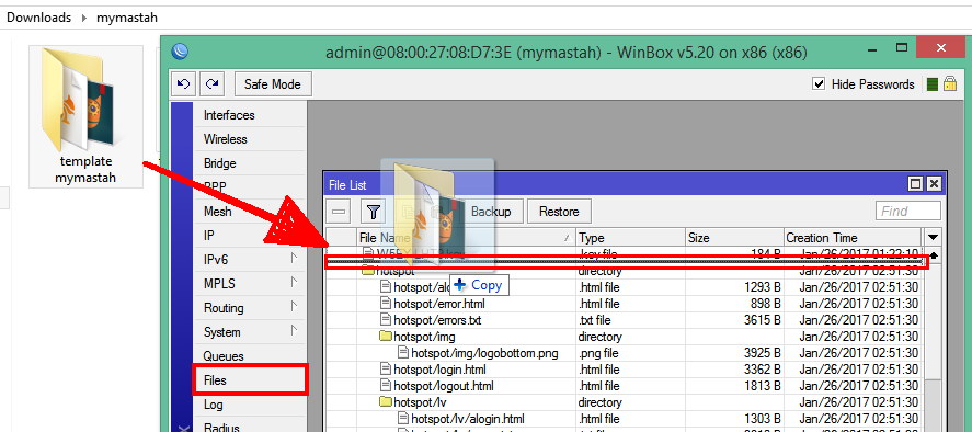 Klik tab menu Files, kemudian seret folder template sobat di sela sela file yang sudah ada pada kolom File list. Tujuan meletakkan folder template di sela sela file yaitu agar direktori hotspot sobat tidak tercampur dengan file file yang sudah berada di penyimpanan File List