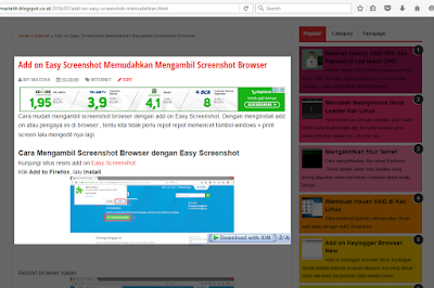 Cara mudah mengambil screenshot browser dengan add on Easy Screenshot. Dengan menginstall add on atau pengaya ini di browser , tentu kita tidak perlu repot repot memencet tombol windows + print screen, lalu mengedit nya lagi.