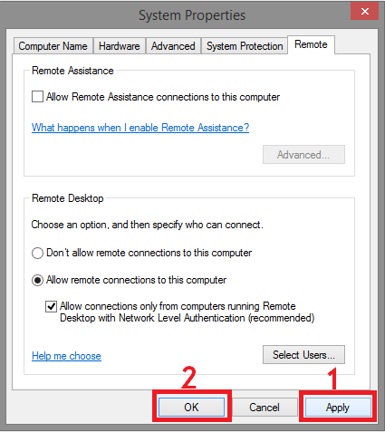 Centang pada opsi Allow remote connections to this computer