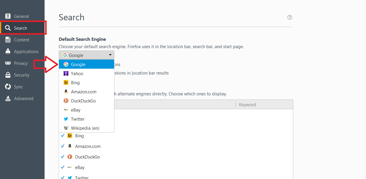 Maksut dari default search engine adalah menjadikan google sebagai mesin pencari default Firefox. Mozilla Firefox menggunakannya di lokasi bar , bar pencarian , dan halaman awal.