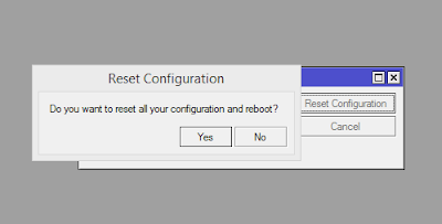 Reset configuration berguna untuk menghapus semua konfigurasi pada router dan mengembalikannya ke posisi default, yaitu keadaan ketika pertama kali mikrotik di install