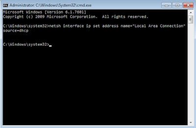 netsh interface ip set address name=”Local Area Connection” source=dhcp
