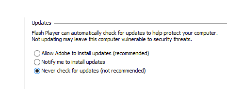 Ada baiknya kita nonaktifkan saja. Jika kalian ingin mengupdate versi flashplayer, lakukan saja secara manual. Bisa kalian cek sendiri ke web resmi apakah ada pembaruan atau tidak.