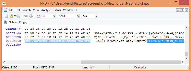 Kali ini saya menggunakan HexEditor Hxd untuk melakukan analisa pada string yang terdapat pada gambar NabilaJKT.jpg.