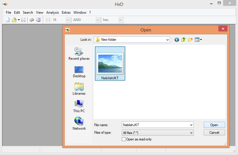 Buka tool Hxd, klik open kemudian arahkan ke foto NabilaJKT.jpg.