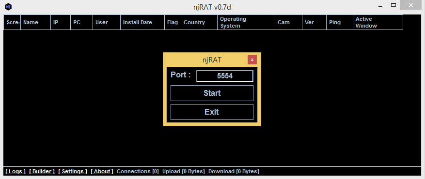 Diawal tampilan, panel njRAT akan meminta kita untuk memasukkan port, biarkan secara default terisi port 5554 atau bisa sobat isi sesuai keinginan.