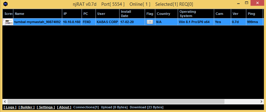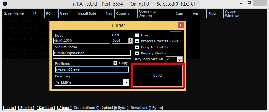 Melalui menu builder inilah backdoor/rat/payload/shell yang berfungsi sebagai penghubung antara pc target dengan panel njRAT kita dibuat. Isikan opsi Host sesuai dengan ip address komputer. Dibawahnya merupakan nama yang diberikan panel njRAT jika sudah mendapatkan korban. Kemudian dibawahnya adalah opsi ExeName, fungsi dari opsi ini yaitu memberikan identitas(PID) ketika backdoor dijalankan oleh pc target, jadi kalau backdoor yang sudah saya buat tadi di klik oleh korban, yang terbaca di task manager adalahΒ system32.exe (mengelabuhi korban wkkw)