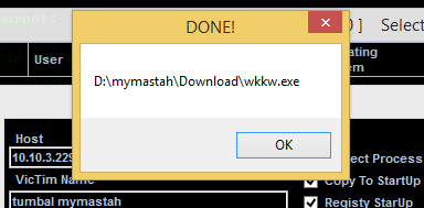 Dimenu sampingnya terdapat pilihan opsi Protect Process (BSOD), fungsinya yaitu jika backdoor yang sudah ditanam pada pc target di end task, maka dengan seketika komputer akan langsung bluescreen. Sedangkan opsi Copy to StartUp dan Registry StartUp berfungsi supaya backdoor di tanam pada registry dan otomatis dijalankan setiap kali komputer menyala.