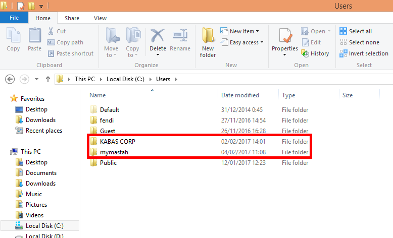Didalam folder inilah direktori user akun yang terdaftar pada windows terkumpul.