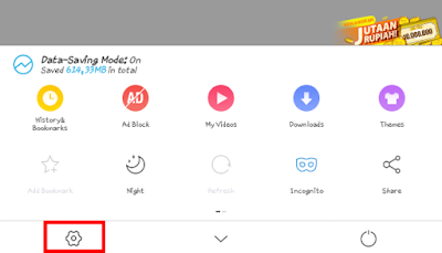 Buka UC Browser. Klik tombol strip di bagian bawah layar