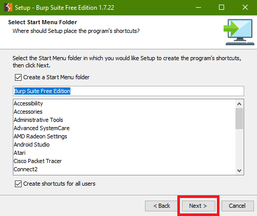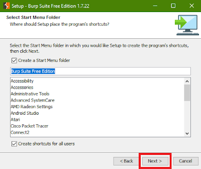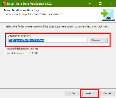 Atur lokasi direktori installasi Burp Suite, atau biarkan secara default terinstall di C:Program FilesBurpSuiteFree. Lalu Next >
