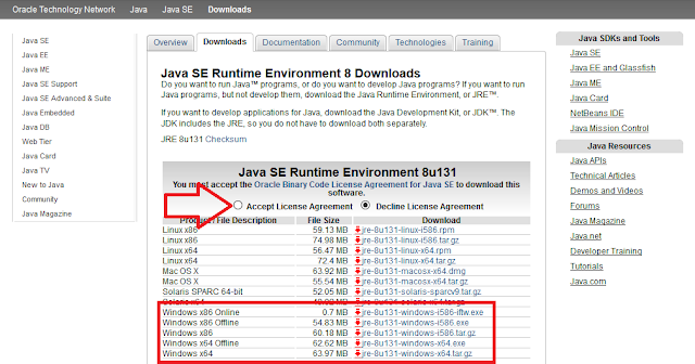 Pertama-tama download JRE Java http://www.oracle.com/technetwork/java/javase/downloads/jre8-downloads-2133155.html . Berikan centang pada opsi Accept License Agreement. Silahkan pilih yang versi Offline dan ber-ekstensi exe.