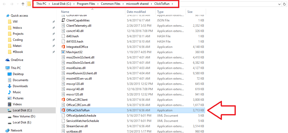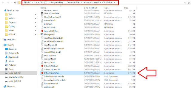 Sebelum mengikuti tutorial ini, silahkan sobat cek direktori installasi Microsoft Office. Letaknya di Program Files > Common Files > microsoft shared > ClickToRun. Cek apakah terdapat Aplikasi OfficeClickToRun. Jika sobat tidak menemukannya, saya sarankan untuk melakukan uninstall dan reinstall Office (install ulang Microsoft Office).