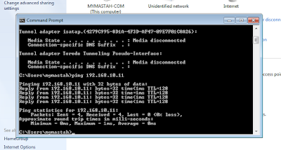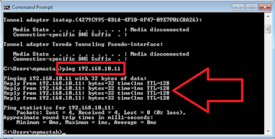 Jika sudah, coba ketikkan perintah ipconfig di cmd untuk melihat apakah ip address yang kita isikan secara manual tadi benar-benar tersimpan.