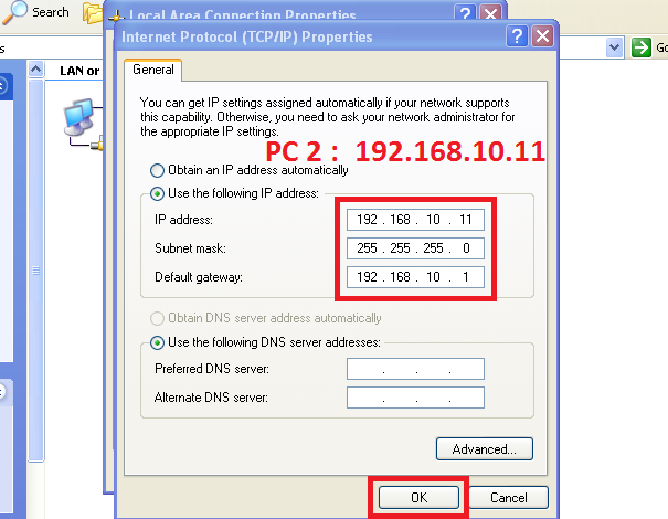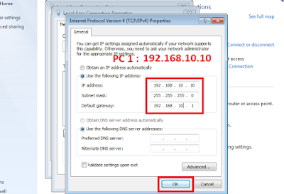Kita isikan IP Address untuk Windows 7 (Komputer 1) secara manual. Di tutorial kali ini, saya akan memberikan ip address 192.168.10.10. Sedangkan subnet mask saya buat 255.255.255.0 dan default gatewaynya adalah 192.168.10.1.
