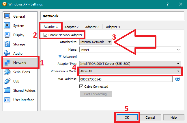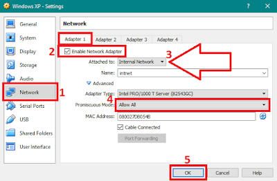 Masuk ke menu Network. Aktifkan adapter nya (saya menggunakan Adapter 1). Berikan centang pada opsi Enable Network Adapter. Kemudian di menu bawahnya ubah pilihannya menjadi Internal Network. Jika sudah, klik OK untuk menyimpan.