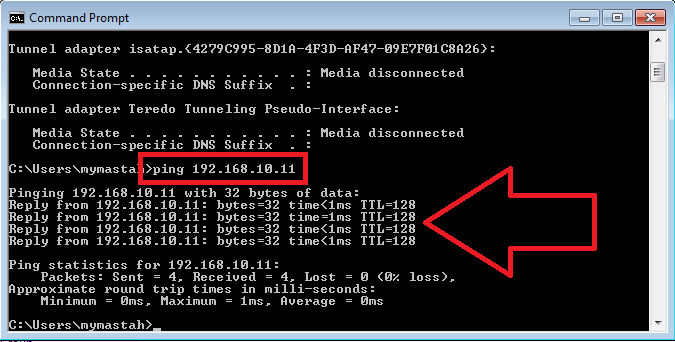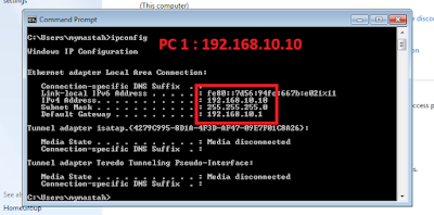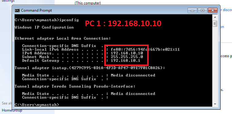 Buka CMD, ketikkan perintah ipconfig untuk melihat apakah pengaturan ip address secara manual sudah tersimpan atau belum. Bisa dilihat, ip address yang saya isikan sudah tersimpan.