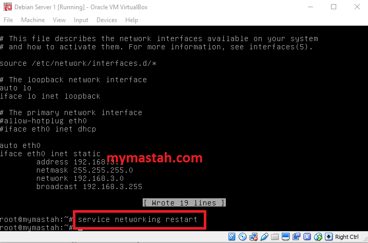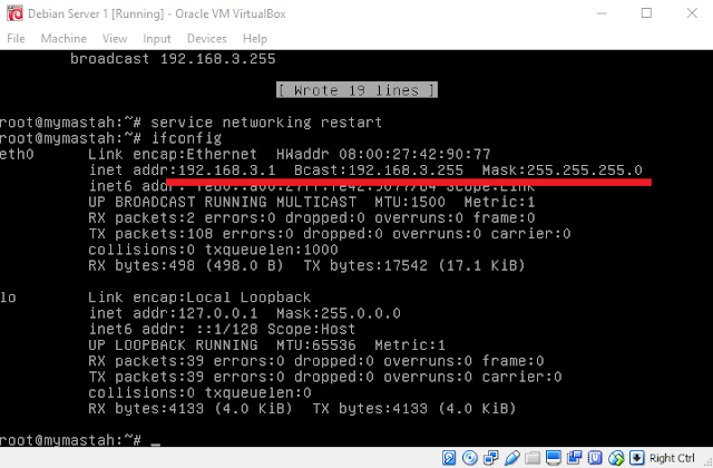 eth0 (sesuaikan dengan nama interface di ifconfig). 192.168.3.1 merupakan ip address untuk OS Debian di VirtualBoxnya, bisa sobat ganti sesuai keinginan