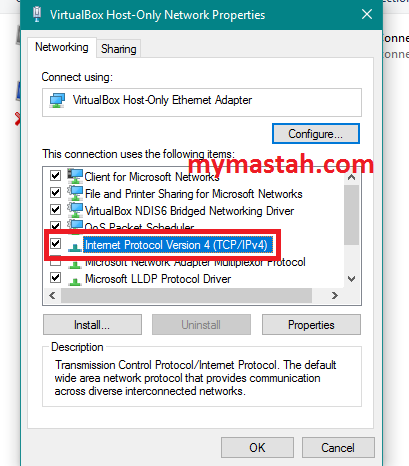 Buka Control Panel > Network and Internet > Network Connections. Klik kanan pada interface VirtualBox Host Only-Adapter. Pilih Properties
