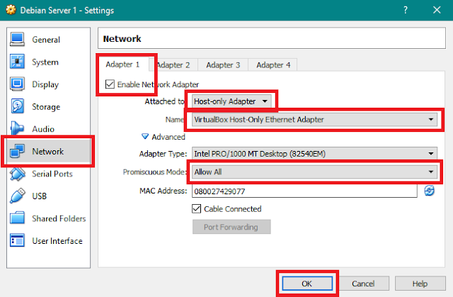 Klik pada tab menu Adapter 1(terserah), berikan centang pada opsi Enable Network Adapter. Lalu pada menu di bawahnya, ubah pilihan Attached to menjadi Host-only Adapter. Sedangkan pilihan pada menu name arahkan ke VirtualBox Host-Only Ethernet Adapter. Jika sudah, klik OK untuk menyimpan pengaturan