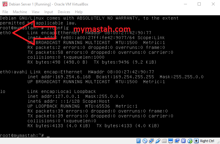 Ketikkan perintah ifconfig untuk melihat nama interface yang terbaca oleh OS Debian. Pada Debian saya, interface Host Only Adapter terbaca menjadi eth0