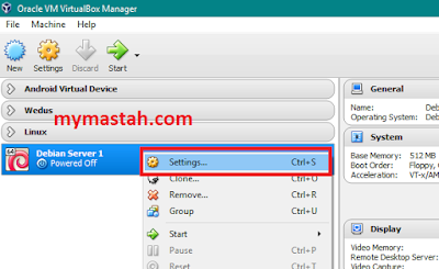 Buka VirtualBox. Klik kanan pada Sistem Operasi Debiannya, pilih menu Settings