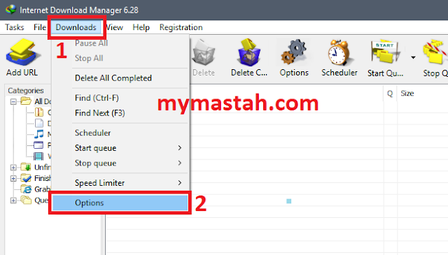 Cara untuk mengatasinya yaitu dengan mencantumkan ekstensi baru tersebut ke daftar File types downloader milik IDM. Buka IDM, klik menu Downloads, kemudian pilih Options