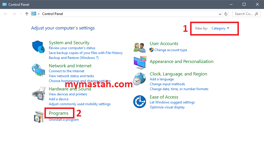 Buka Control Panel. Masuk ke menu Program (agar lebih mudah mencarinya, ubah view type menjadi Category)