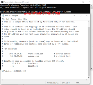 Notepad C:WindowsSystem32driversetchosts - Hasilnya akan tampil di bawah ini, di sini kalian bisa menghapus atau menambahkan daftar ip atau url yang akan di edit pada file host.