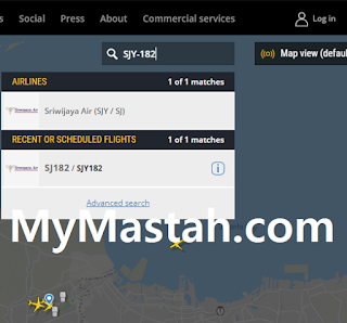 1. Pengecekan kali ini saya dengan mudah dengan mengujungi website www.flightradar24.com , lalu cari menu pencarian ( search ) dan ketik kode penerbangan dalam hal ini saya memberi contoh yang saat ini SJY-182 terbaru